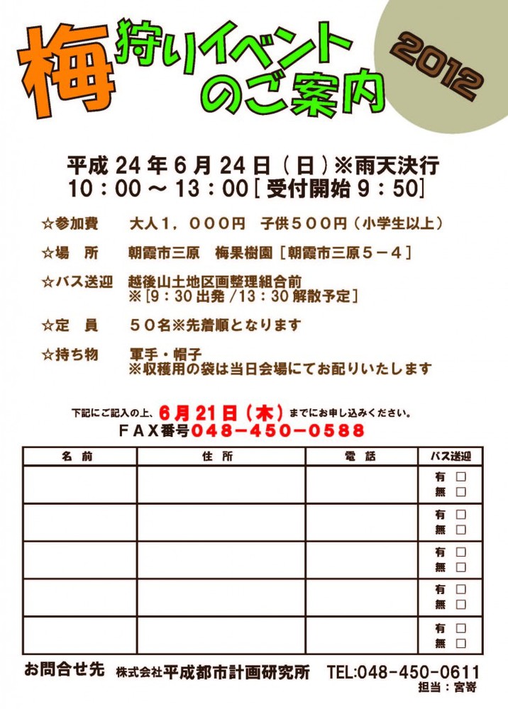 毎年恒例となりました梅狩りイベントを今年も下記の日程で行います。