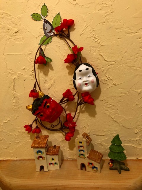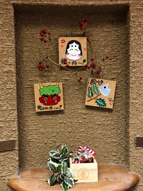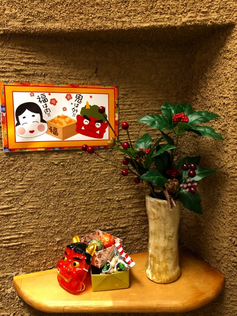 ディスプレイは‘節分’に替えました。いままでの小物の形を変え、飾る場所を変えて1品増やして完成!
