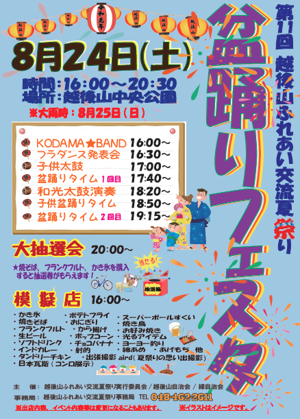 今月24日(土)に和光市南の越後山中央公園で第11回目になりました、ふれあい交流夏祭りが開催されます。盆踊りに大抽選会、各模擬店も勢揃いです。