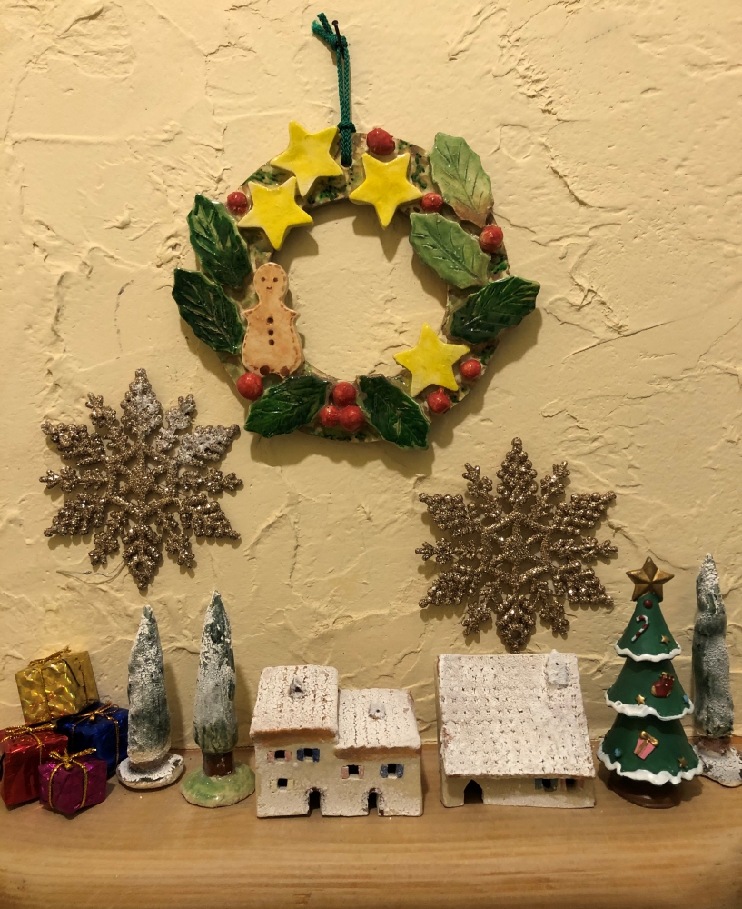 リースは粘土で焼きました。だいぶ前の作品ですが・・・今でもいろいろな場所の壁に登場しています。
