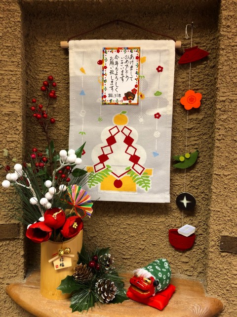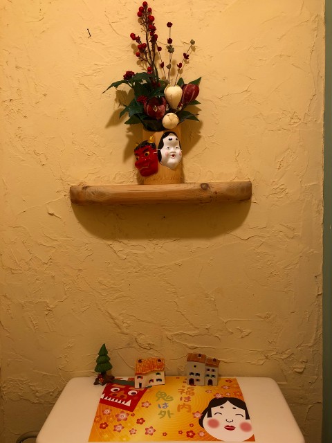 ディスプレイは‘節分’に替えました。いままでの小物の形を変え、飾る場所を変えて1品増やして完成!