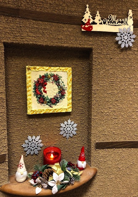リースは粘土で焼きました。だいぶ前の作品ですが・・・今でもいろいろな場所の壁に登場しています。