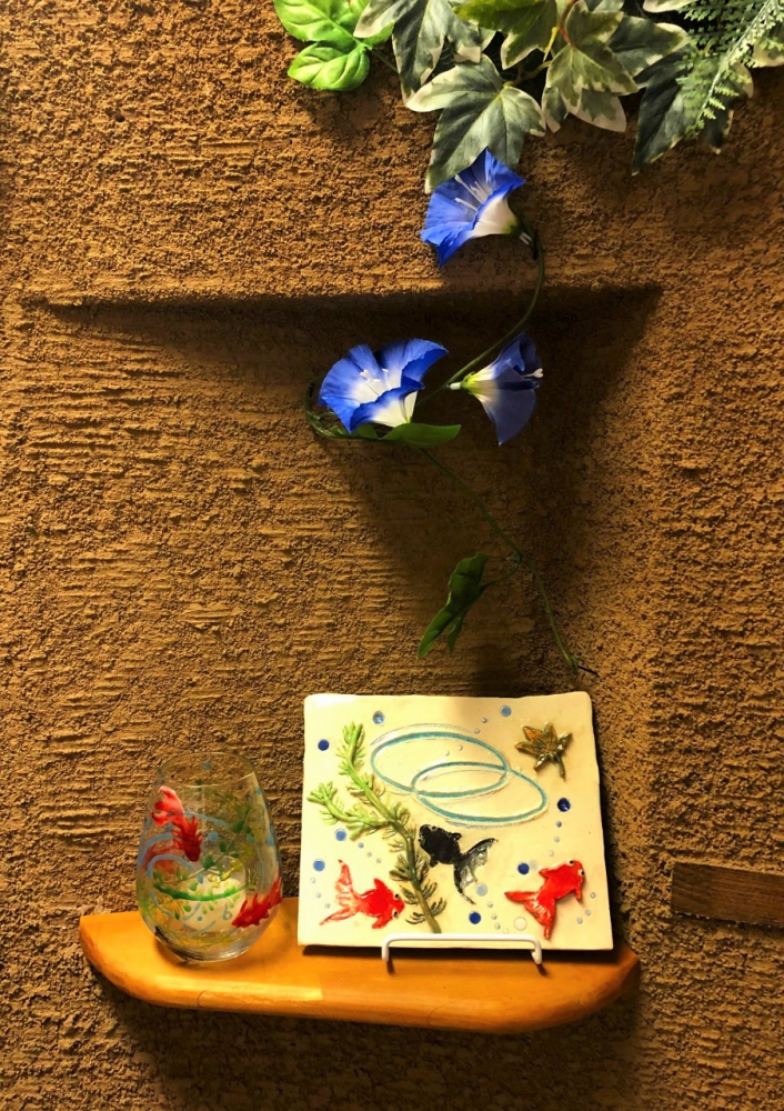 ベランダに手作りプランターを置き、前面にはオーブン粘土で作った陶板を貼り付けました。(陶板は上から春夏秋冬を表現しています。)