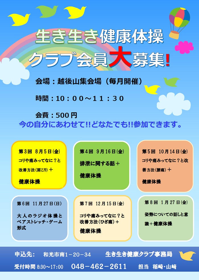 加圧ライブリーサポートが協力している『生き生き健康体操』が、和光市南の越後山集会場で毎月開催されています。今回は2回目ですが、地域の皆さん方と楽しく体を動かしてきました。