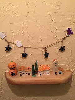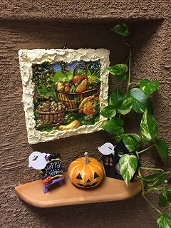 ペーパーアートも小枝の枠にしてみました。かわいいかぼちゃは本物です。