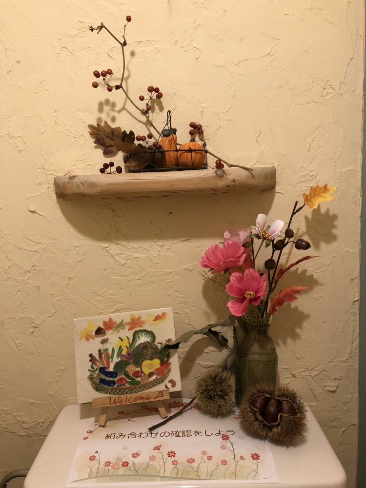 秋のディスプレイは「秋の味覚とコスモス」です。
