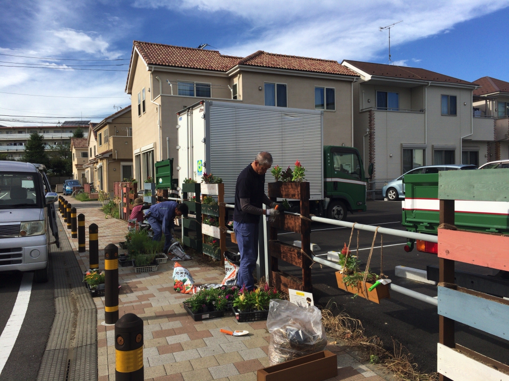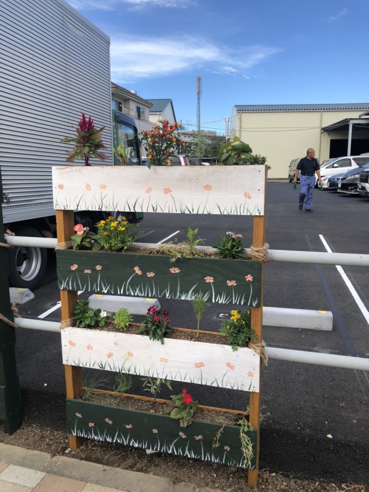越後山地区にて、ハザワ運送さんの駐車場に手作りプランターを設置し、ハーブや野菜、花などの食べられる植物をテーマに植えました!